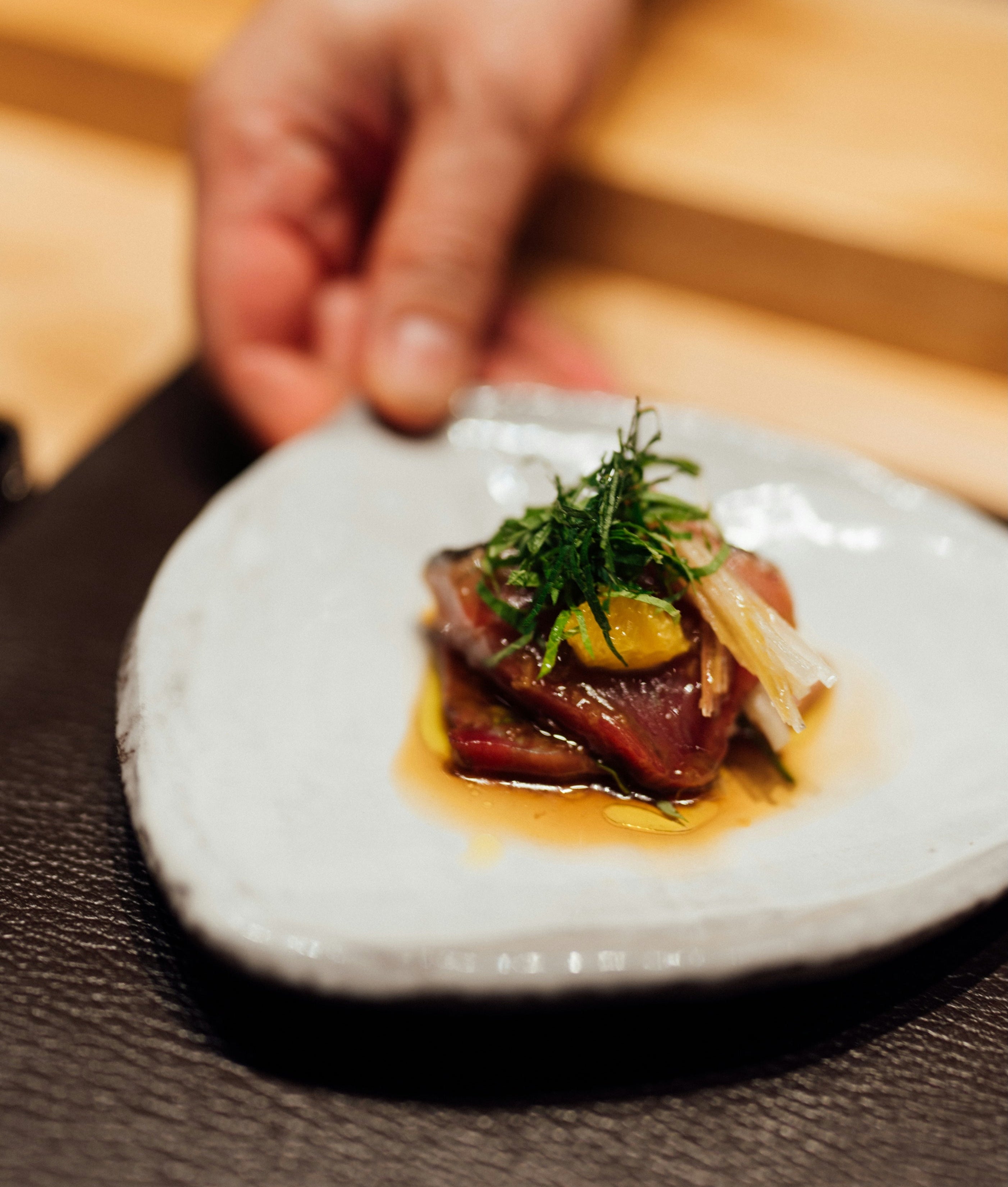 (Spicy Tuna, cucumber, topped w/ Tuna, jalapeño) - Torotaku Roll